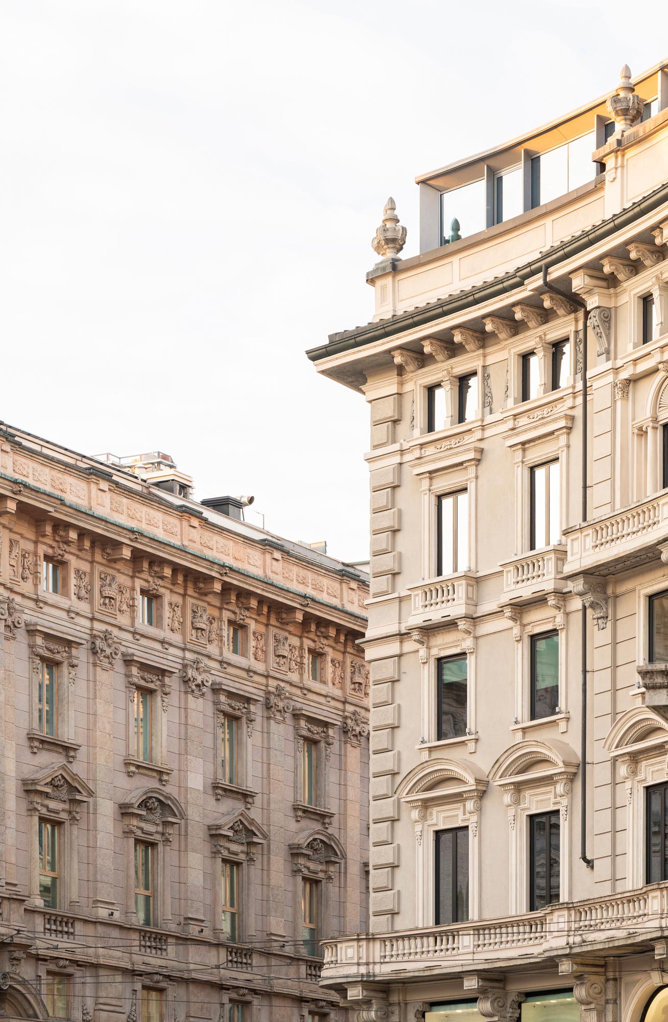 The redevelopment involves both blocks of a building in Milan by Pietro Portaluppi. The project interprets the pre-existing building, welcoming its complexity and respecting its canons. The addition of a contemporary element establishes an interaction between the different stylistic features of the two existing buildings. Each of the three contrasting elements that now make up the architectural complex establishes its own boundary that respects the project's history. The complex consists of two buildings of three and five floors respectively, which are currently occupied by two tenants and, having been designed almost twenty years apart, are different in style. The restoration of the basement floor in the existing internal courtyard resulted in the creation of a lower-ground courtyard, which is overlooked by showrooms and meeting rooms. On the courtyard’s ground floor, overlooking the patio, amenity spaces were created in the building to originally house garages. Characterised by a style that differs from both buildings, the floor added on top of the low building emphasises their historical differences. The inclusion of a metal mesh – brass-plated on the outside and black on the inside – between the two chambers of the building's glass curtain wall, turned its surface opaque, at the same time harmonizing it with the surrounding materials and offering protection from the sun. A thorough clean of the tower's rationalist façade has brought to light the bright grey colour of the Ceppo di Grè. The window frames were also covered with glass, thus maintaining the essential quality of the design of the façades of both buildings. The modularity of the interior design for the offices of the international law firm that occupies the low building was combined with the client's request for elegance, flexibility and privacy. The fully glazed and soundproofed offices are bright and spacious. Featuring light oak furniture and finishes, the library creates a comfortable environment ideal for concentration.