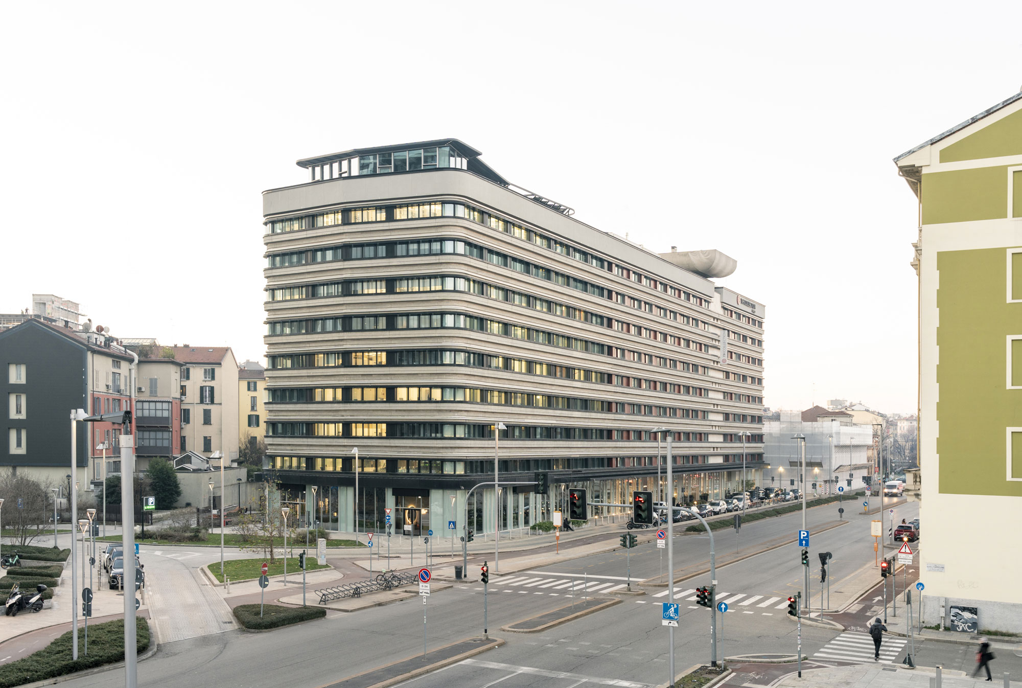 The restyling project on part of Luigi Moretti's complex enhances and highlights a bold architecture that, in the 1950s, had an impact on an entire block of Milan. The complex consists of several buildings, of which two were the object of redevelopment. Studying the original drawings was crucial to understanding the project's genesis and evolution over the years. Complying with and respectful of the original intervention, Park Associati's project aims to enhance what for the city has become an iconic building. The name Nave (Ship) comes from the fact that, in the elegant layout of the two buildings overlooking Corso Italia, the higher one leaning on the lower one resembles the bow of a ship breaking through space towards the street. This perception is further emphasised by the light-coloured façade covered with white marble mosaic tiles. The restyling focused on the communal areas and on some of the floors for office use. A delicate design idea emphasises the original forms, of the façade, completely preserved. The discreet but effective lighting intervention highlights the horizontal string courses, thus emphasising the building's character and creating a 'floating' effect of the structure over the underlying base. The lower body of the complex was renovated following Moretti’s first original drawings. The horizontal string courses were thus emphasised while on the first and second floors the windows' layout was accentuated by box-shaped slats made of micro-perforated aluminium. In the dark, their presence is highlighted by the slats' internal lighting. All the office spaces were redesigned through interventions on systems, lighting and air conditioning focusing on transparency and the search for quality space, thus making them more open and flexible.