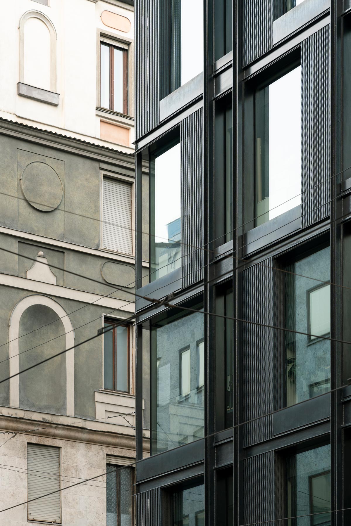 Un’analisi filologica e attenta del progetto originale, unita ad un nuovo percorso progettuale che fa del dettaglio la propria forza, offre agli spazi di Gioiaotto una flessibilità ed una luminosità interna in piena sintonia con l’architettura contemporanea, supportate dal prestigio di un edificio unico e aderente alla memoria storica Milanese. L’edificio originariamente denominato ‘Residence Porta Nuova’, ultimato nel 1973 su progetto di Marco Zanuso e Pietro Crescini, è rappresentativo di una serie di interventi nell’area di Porta Nuova a Milano e resta un segno importante dell’attività architettonica di quel periodo. La hall d’ingresso pone in contrasto superfici ruvide che rifrangono mentre altre riflettono la luce naturale diurna e quella artificiale notturna. All’interno dei piani un grande serramento segue il passo strutturale in orizzontale e si tripartisce in verticale. La parte superiore, opaca ed inclinata, indirizza la luce naturale sull’intradosso del soffitto. La parte di mezzo, completamente trasparente e apribile, mette in comunicazione l’ambiente lavorativo con l’esterno mentre la parte inferiore alterna archivi in adiacenza alla postazioni ed elementi tecnici. Il passo dei serramenti è sottolineato all’interno da pinne in vetro extrachiaro che aumentano la flessibilità permettendo l’installazione di pareti mobili, mentre all’ esterno si alternano pinne in vetro extra-chiaro e vetro colorato in pasta grigio chiaro. Davanti ai pilastri si trovano box in lamiera microforata-pressopiegata. Nella parte dell’hotel invece, il passo dei serramenti esistenti è evidenziato attraverso l’alternanza di lame in vetro trasparente messe in discontinuità da pinne e box in legno. La facciata a piano terra ha un ritmo di moduli trasparenti in alternanza a parti opache strutturali coperte da serramenti serigrafati su due livelli. La stessa composizione della parte uffici si ripete qui al piano terra per aumentare l’effetto tridimensionale della facciata.