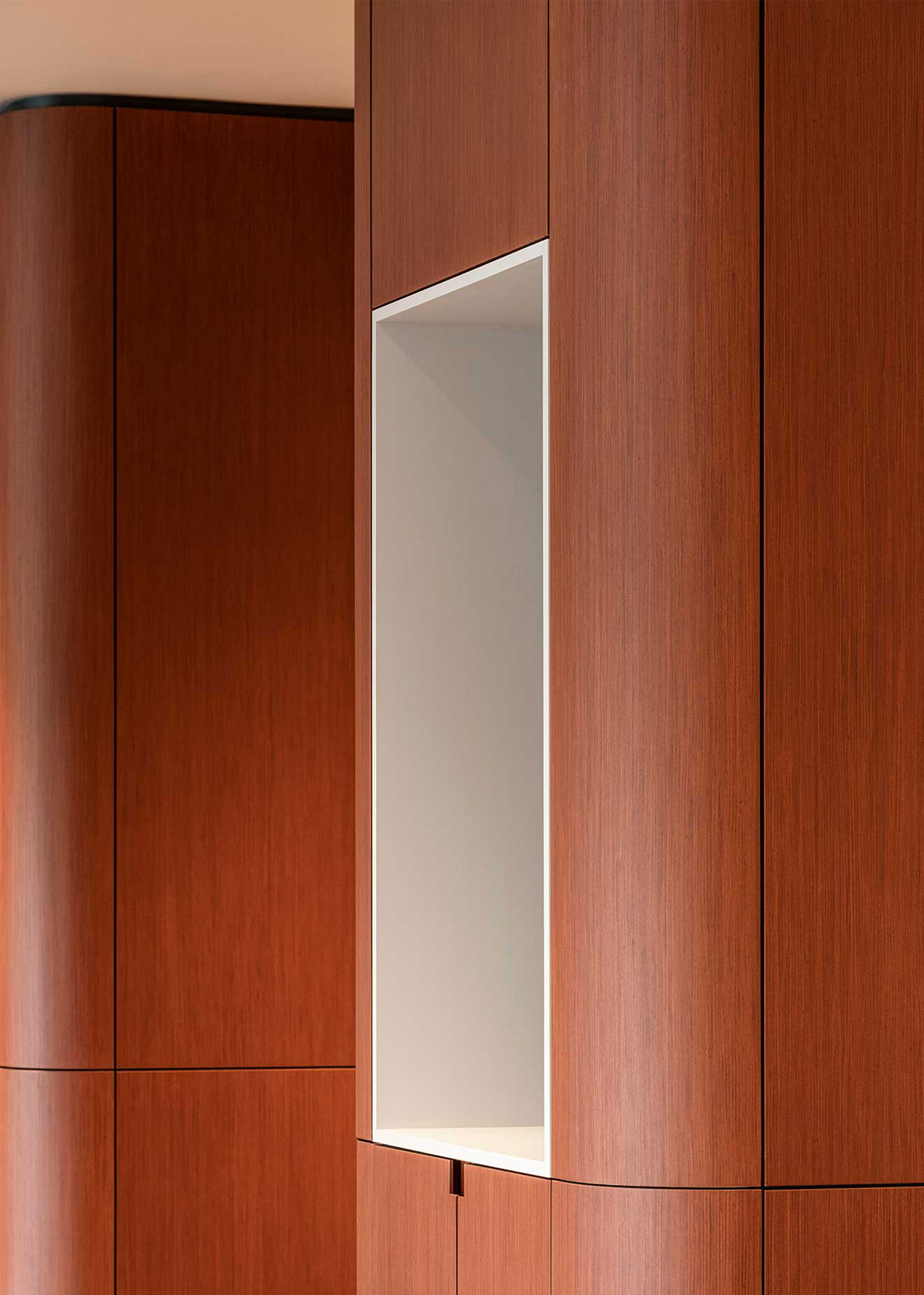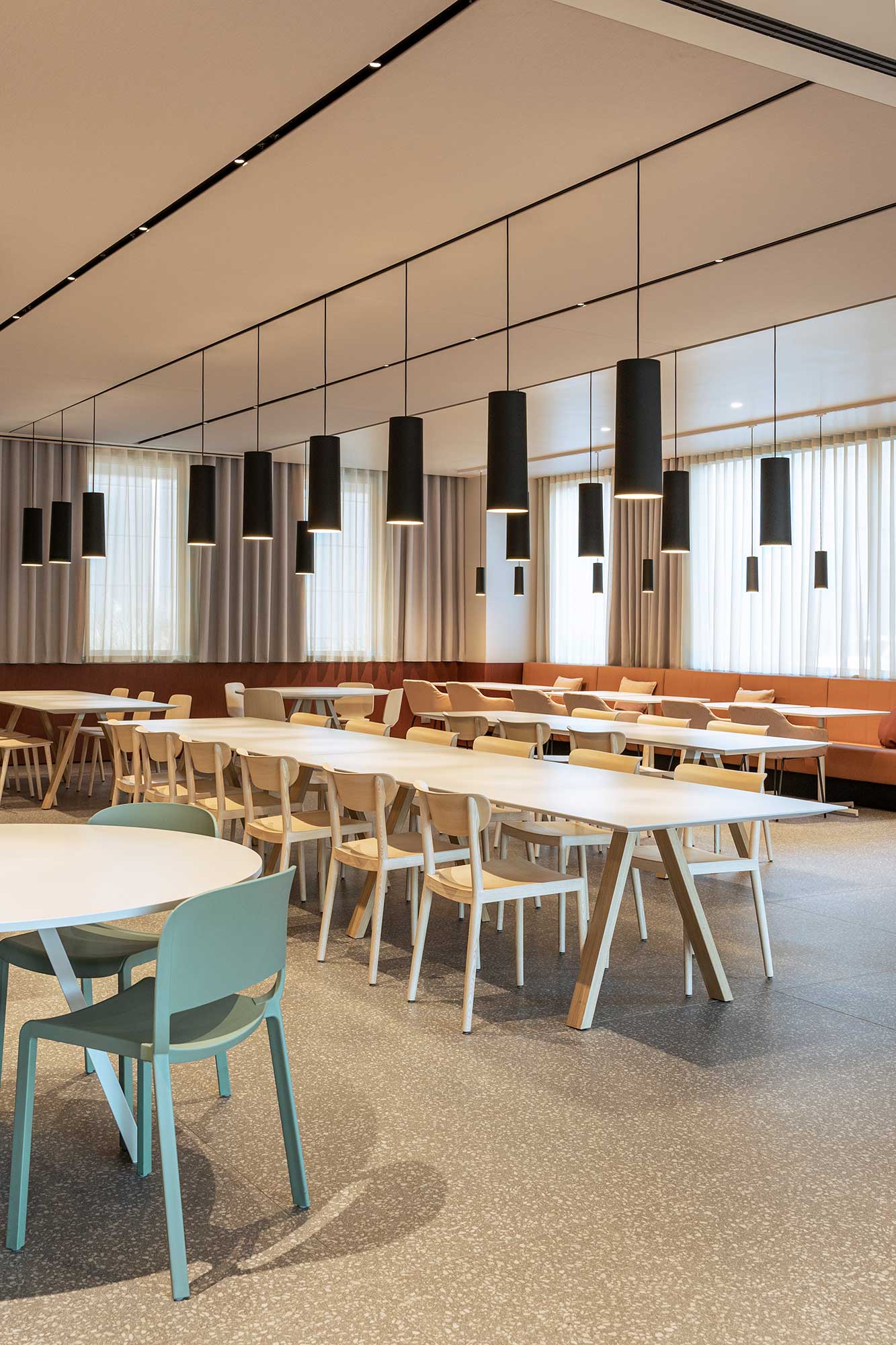 L’apertura di una grande parete vetrata verso l’esterno rende protagonista la luce naturale, donando all’ambiente luminosità e ariosità, e permette un collegamento diretto con lo spazio esterno. Un rivestimento in impiallacciato di legno ricostruito, color terracotta, caratterizza le boiserie e gli elementi di arredo a tutta altezza, uniformando lo spazio sia a livello materico che cromatico, e contribuisce alla circolarità del progetto. L’impiallacciatura è infatti realizzata con legno ricomposto ottenuto da lavorazioni industriali innovative e prodotto con colle prive di emissione di formaldeide. Un sistema di tendaggi in parte filtranti e in parte coprenti rende l’ambiente più accogliente e ospitale e ne migliora l’acustica. Il controsoffitto accoglie sia i pannelli fonoassorbenti rivestiti in tessuto che i binari elettrificati per ospitare luci decorative della collezione lighting Pedrali e architetturali. I tavoli e le sedute Pedrali, organizzati in varie soluzioni, favoriscono diverse situazioni di convivialità. Un’area più riservata, separata dal resto dello spazio da lamelle verticali in boiserie disposte in maniera dinamica, garantisce privacy in occasione di pranzi formali. La scelta degli arredi, dei tessuti e dei colori, affrontata insieme al cliente, crea la migliore armonia tra la scatola architettonica e la produzione degli arredi Pedrali.